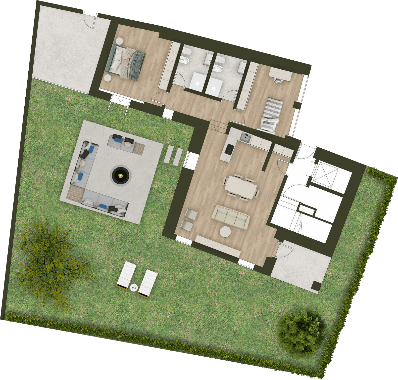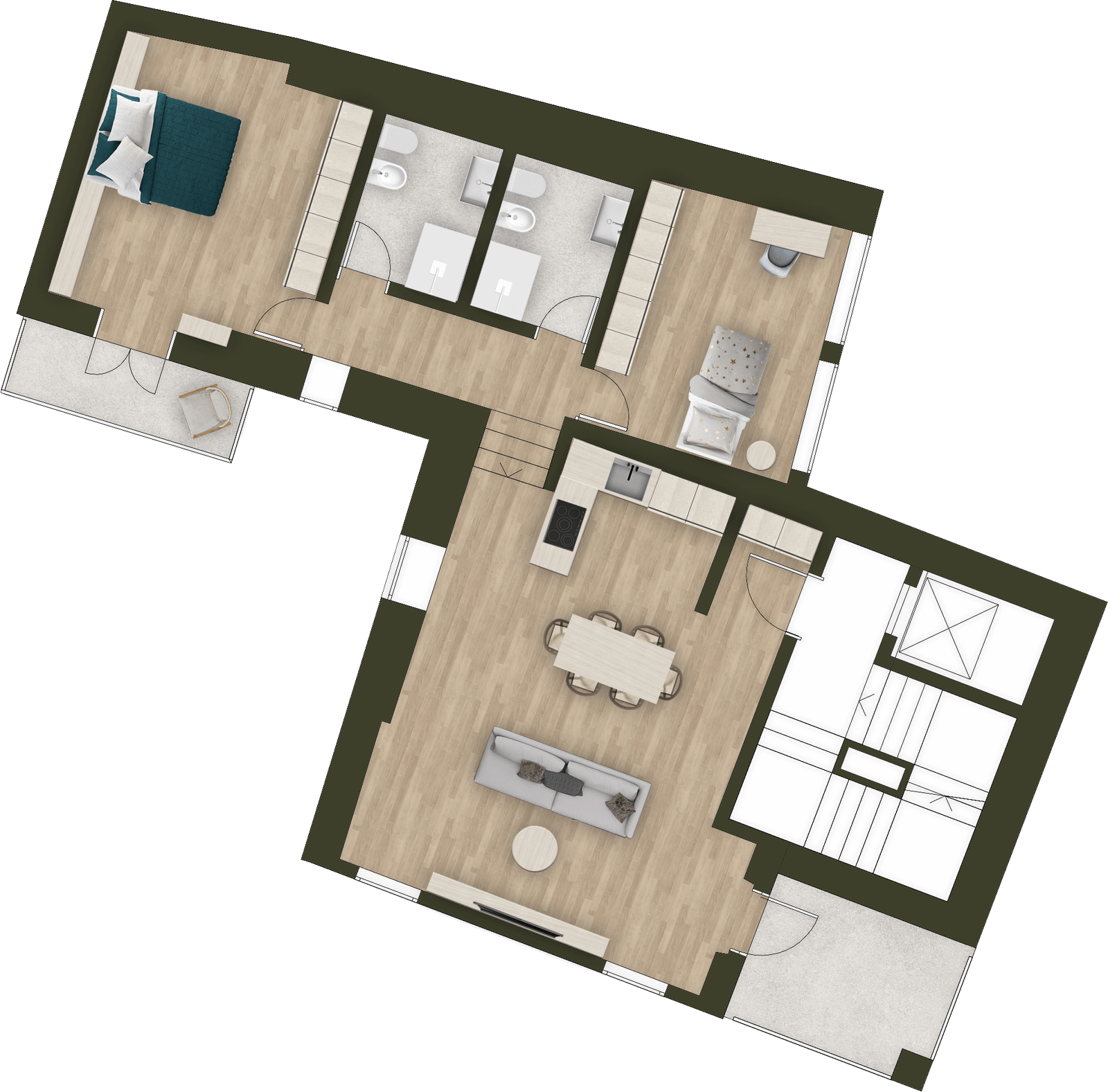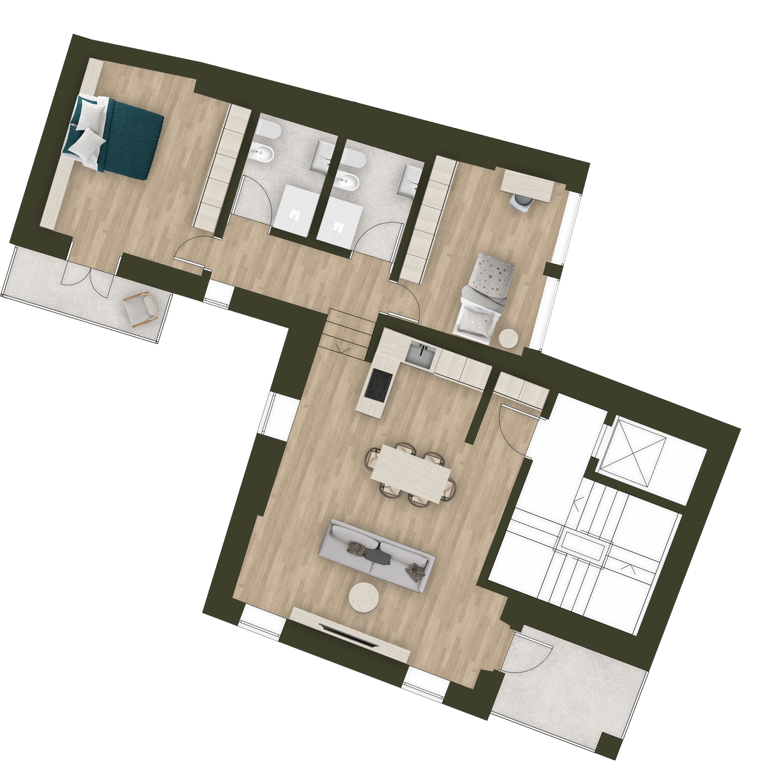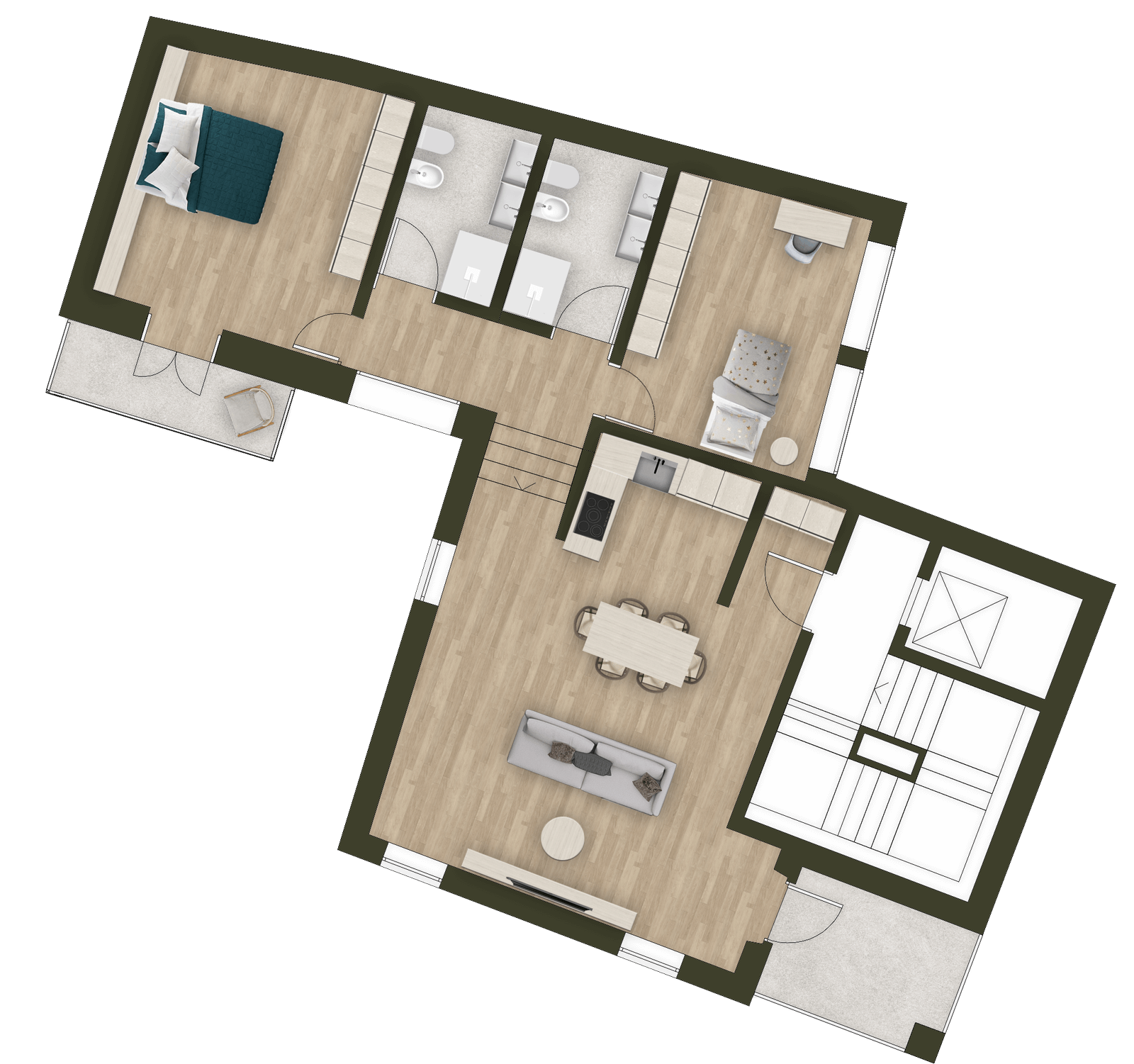 I contenuti grafici quali render e virtual tour potrebbero non coincidere con l'esatta conformazione della singola unità.